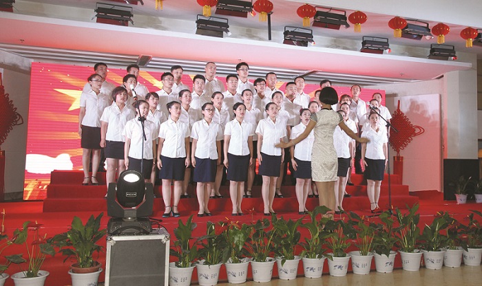 周年暨七一頒獎晚會”上,我公司選送的節目大合唱《沒有共產黨就沒有新中國》贏得了滿堂彩,將晚會推向了高潮(圖為合唱現場)。